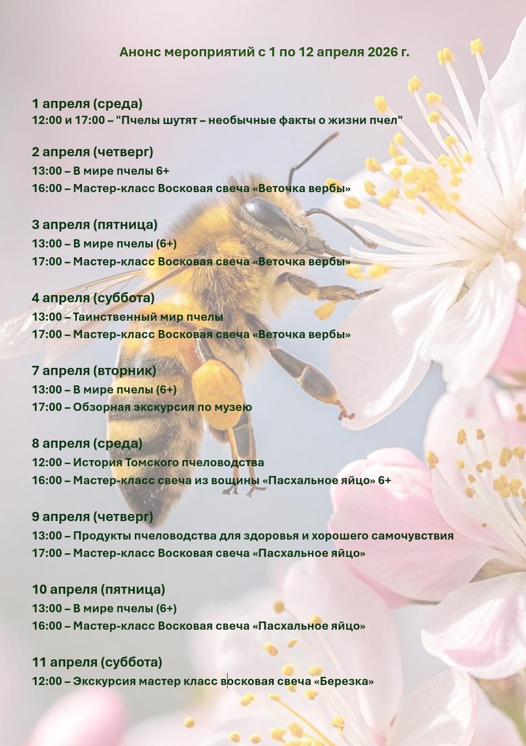 Друзья, мы подготовили для вас насыщенную программу на апрель 2026 г.! В нашем музее меда «Пчелотека» вас ждут увлекательные экскурсии, творческие мастер-классы и, конечно, знакомство с удивительным миром пчел.