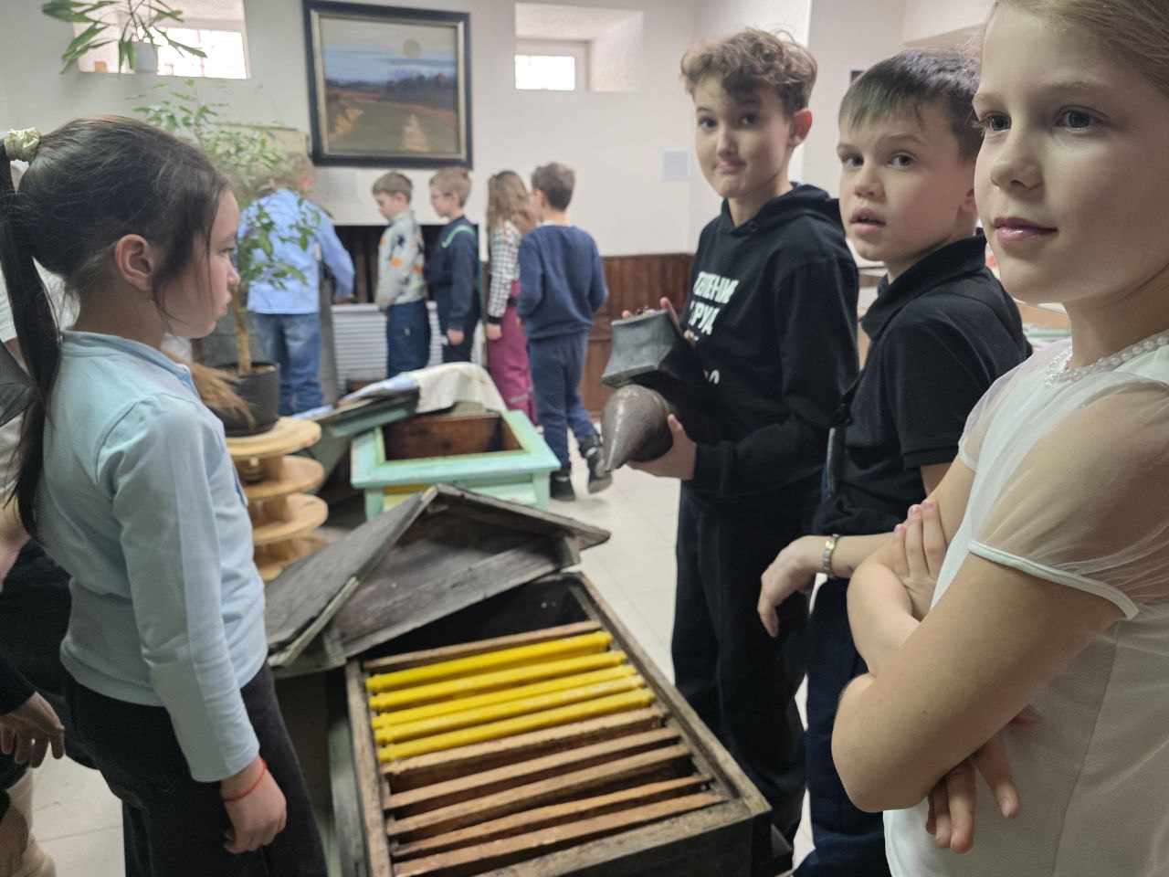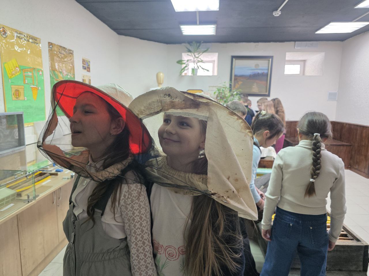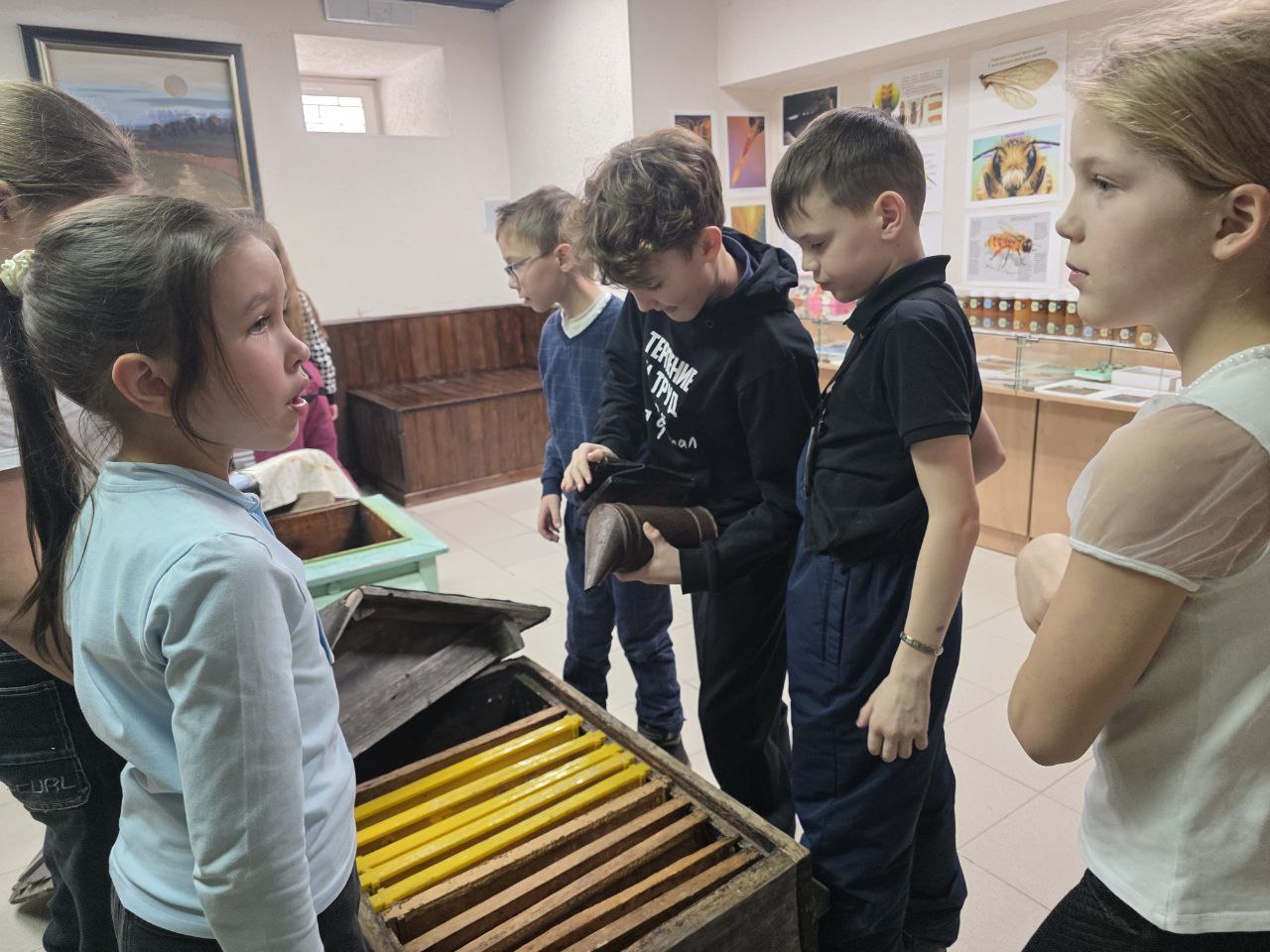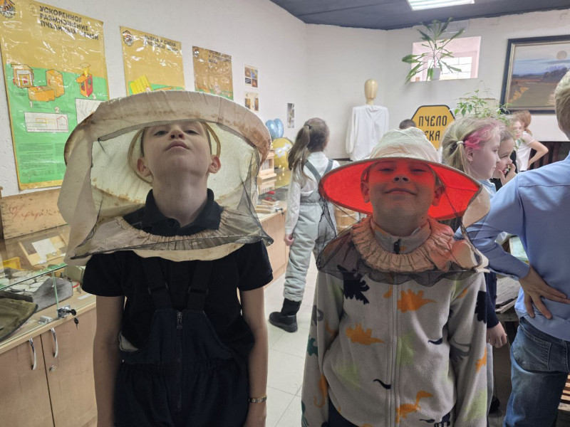 После дегустации мы отправились во второй зал, где рассматривали инструменты пчеловодства, знакомились с врагами пчёл и слушали живые истории из жизни наших ульев. Истории эти — с болью в сердце и с радостью, что в конце концов всё закончилось хорошо. Ребята с удовольствием крутили медогонку, трогали соты, нюхали их, примеряли пчеловодные шляпы, брали в руки дымарь. Им было интересно всё, до мелочей.