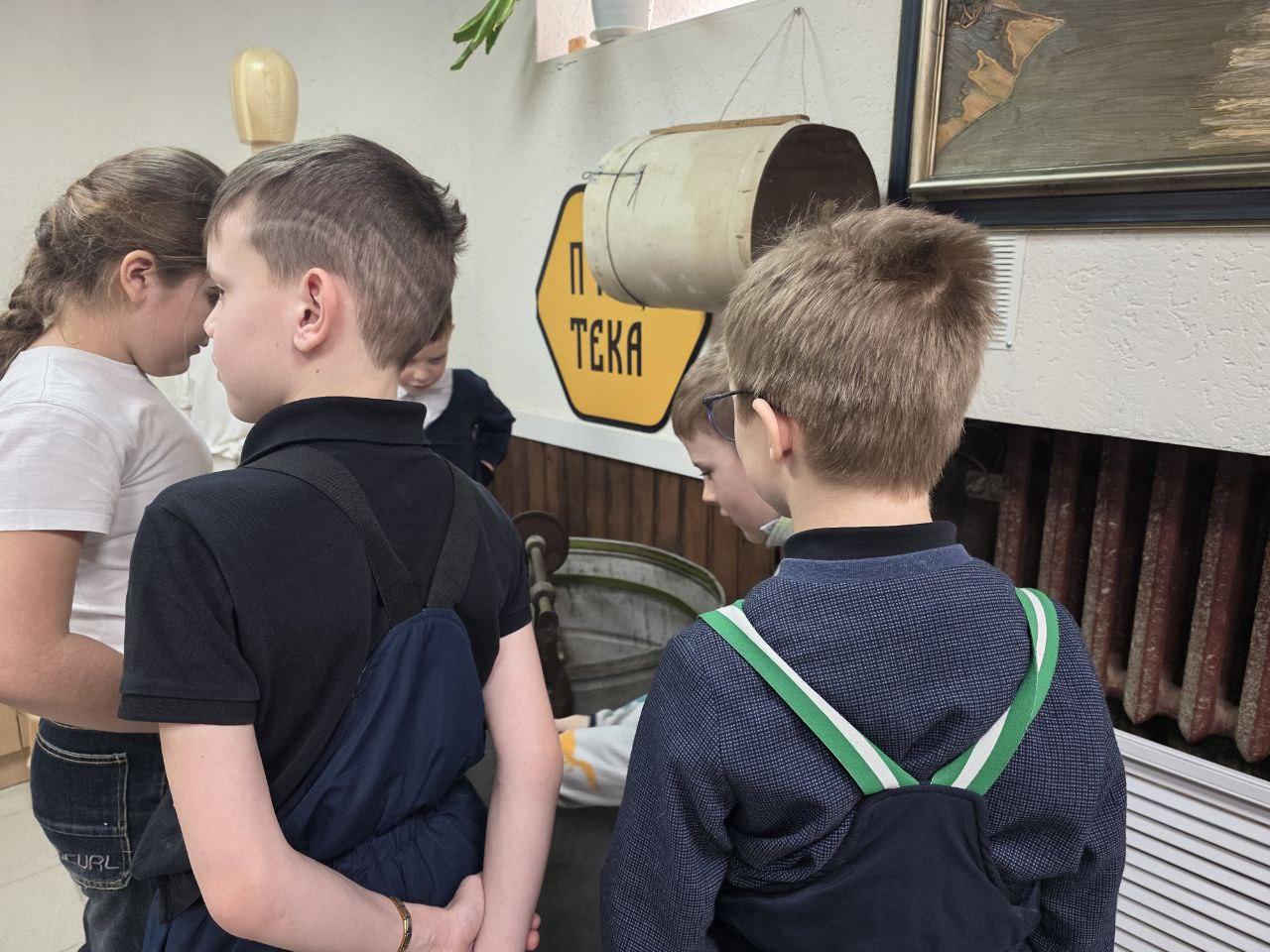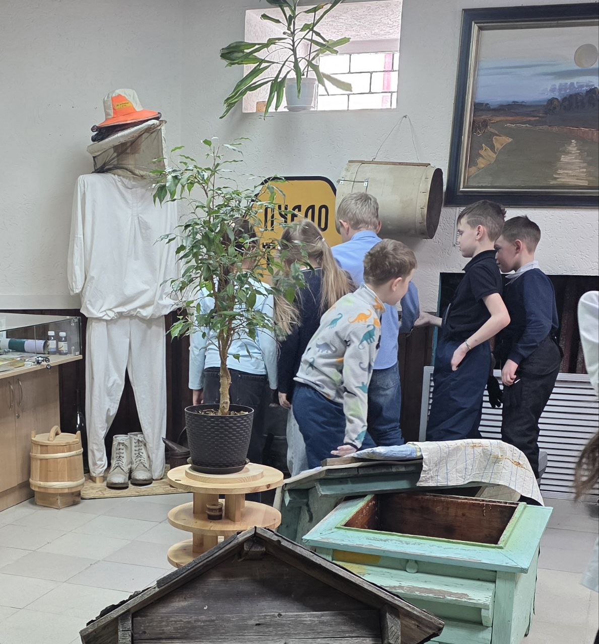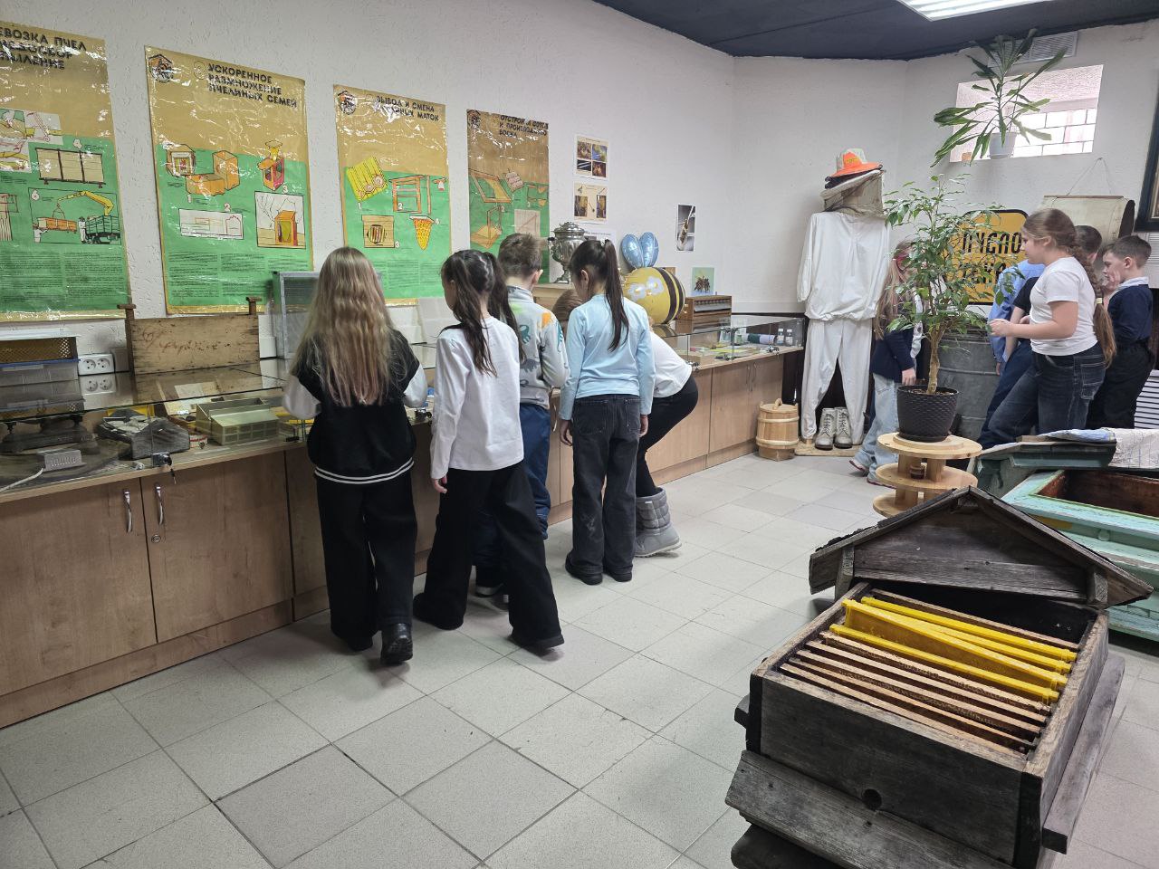 После дегустации мы отправились во второй зал, где рассматривали инструменты пчеловодства, знакомились с врагами пчёл и слушали живые истории из жизни наших ульев. Истории эти — с болью в сердце и с радостью, что в конце концов всё закончилось хорошо. Ребята с удовольствием крутили медогонку, трогали соты, нюхали их, примеряли пчеловодные шляпы, брали в руки дымарь. Им было интересно всё, до мелочей.